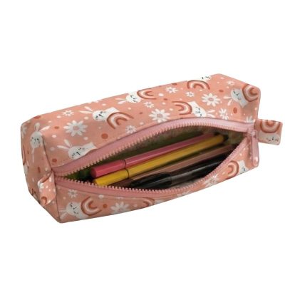 Mochila + estuche + saco de merienda: el trío perfecto para la vuelta al cole. Todo con el mismo estampado y el nombre de tu peque bordado. Elige Robotix Azul para el fan de los robots, Daisy Naranja para las amantes de los conejitos y margaritas, o Conejitos Rosa para las soñadoras.